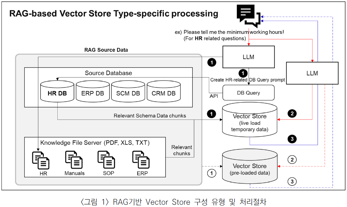 특히 금융분야에서는 고객 응대 챗봇을 통한 최신 정보 제공의 중요성에 대두되며, LLM의 정보 제한성과 환각(Hallucination) 문제는 이러한 모델들의 도전 과제로 지적되고 있다. 이를 해결하기 위한 접근방식으로는 새로운 데이터로의 파인튜닝과 프롬프트 콘텍스트에 직접 정보를 삽입하는 방안이 있으나, 파인튜닝의 경우에 학습을 위한 인프라 준비 등 상당한 비용이 발생하며, 모든 정보를 프롬프트에 넣어주는 것도 현실적으로 어렵기 때문에 이에 대안으로 RAG모델이 제안되었으며, <그림 1>과 같이 정보를 벡터 데이터베이스에 저장하고, 필요한 정보를 검색하여 LLM에 전달 하는 방식으로 구현되기도 한다(정천수, 2023d).