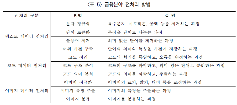 금융 분야에서는 <표 5>와 같은 데이터 전처리 방법들이 주로 사용된다. 이러한 데이터 전처리 과정을 거치면, 금융 상