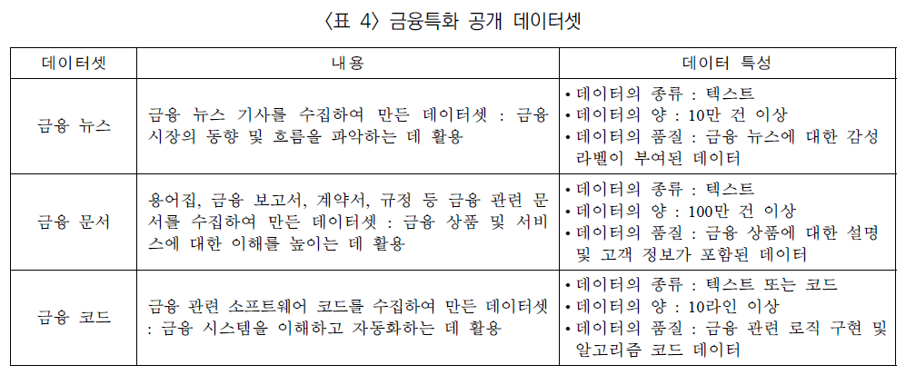 금융 특화 데이터셋을 선정하는 방법은 크게 두 가지로 나눌 수 있다. 첫 번째 방법은 기존에 공개된 데이터셋을 활용하는 방법이다. 금융 분야에서 공개된 데이터 셋으로는 <표 4>와 같은 것들이 있다. 두 번째 방법은 자체적으로 데이터셋을 구축